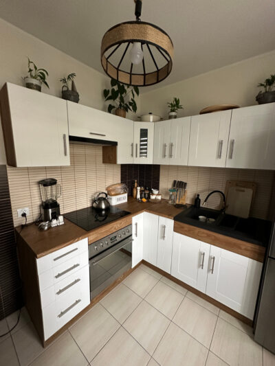 Klientka zdecydował się na oklejenie folią w kolorze białym, oraz na oklejenie blatu w kolorze rustykalnego drewna.